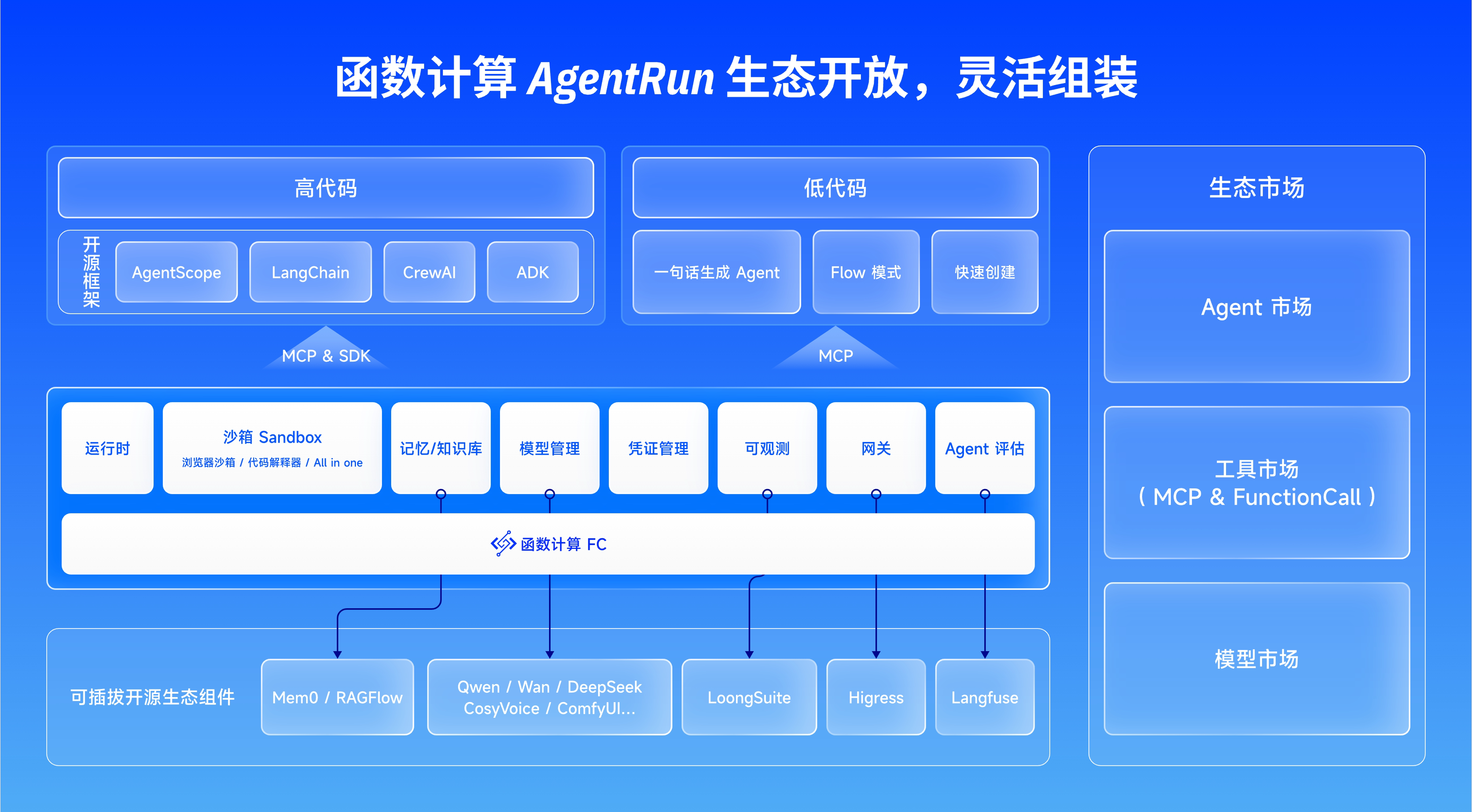 AgentRun 是以高代码为核心,开放生态、灵活组装的一站式 Agentic AI 基础设施平台,为企业级 Agentic 应用提供开发、部署与运维全生命周期管理。平台基于 Serverless 架构提供强隔离的运行时与沙箱环境,深度集成开源生态,为用户提供模型高可用和数据不出域能力。